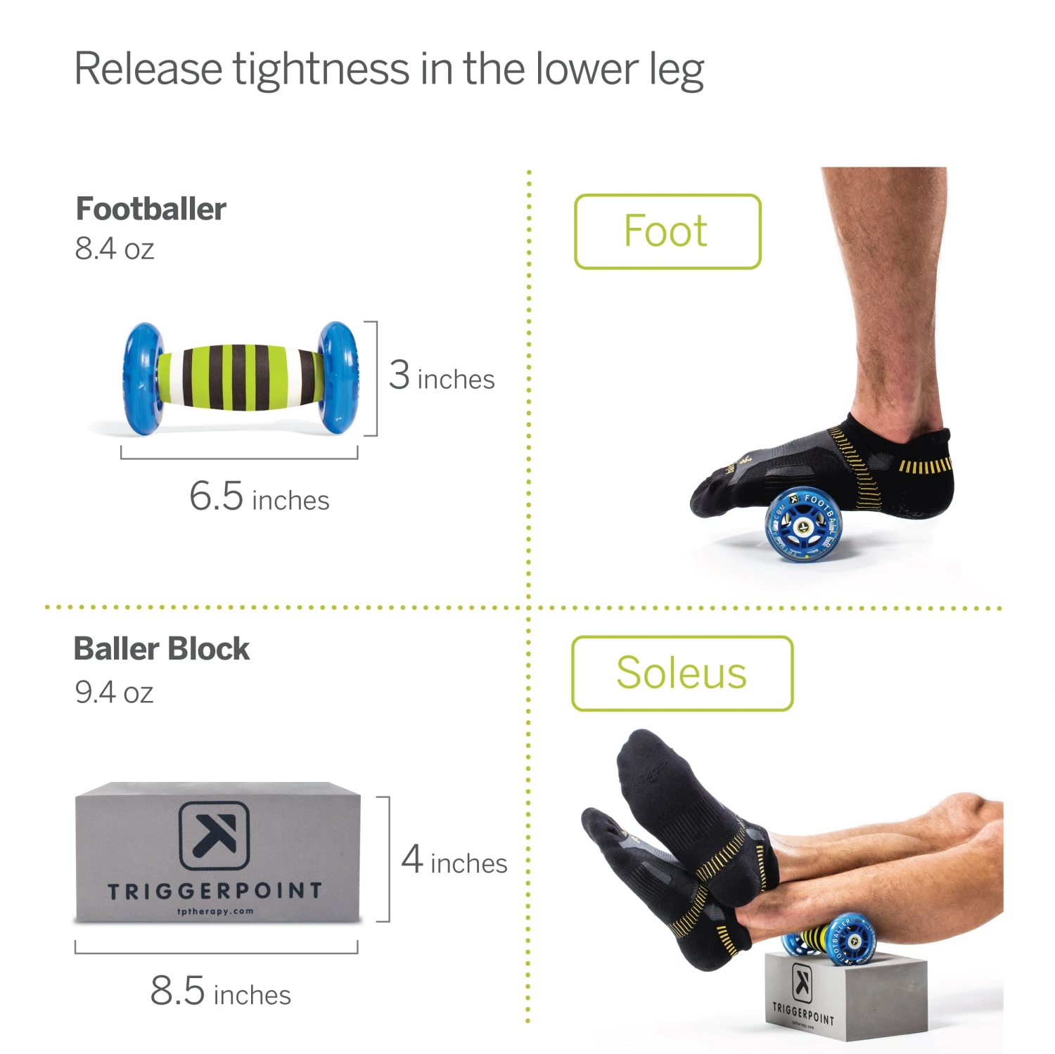 - Baller Block: Provides elevation for optimal range of motion and application of pressure when using TriggerPoint products. Also, reduces space and houses the Footballer when not in use.